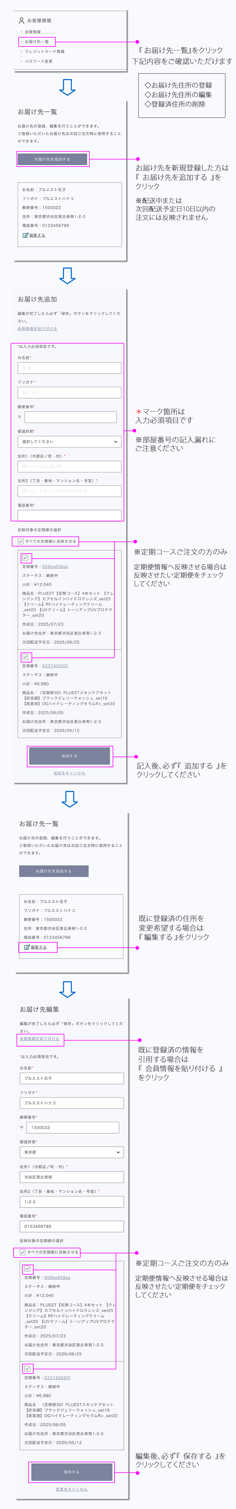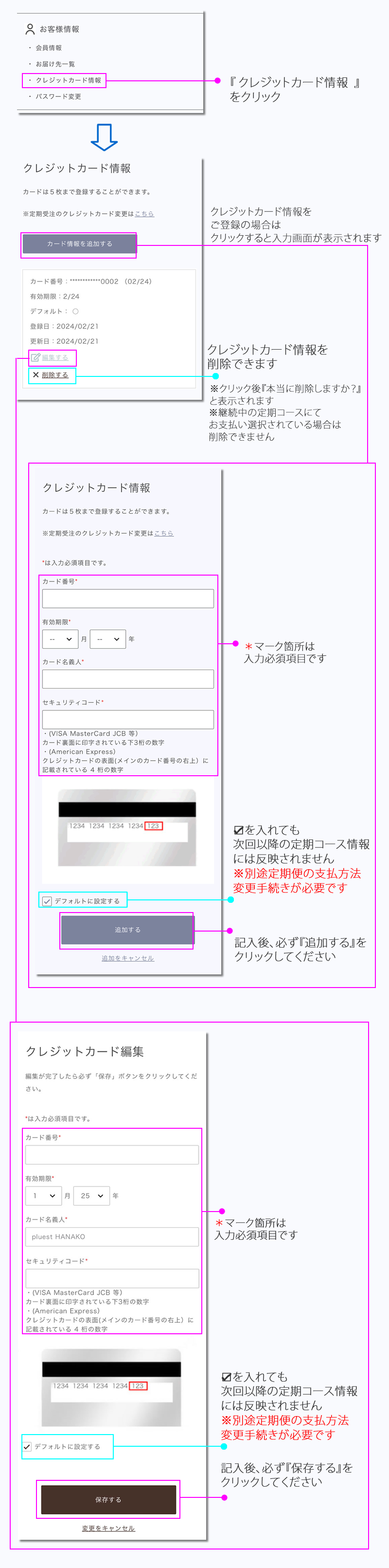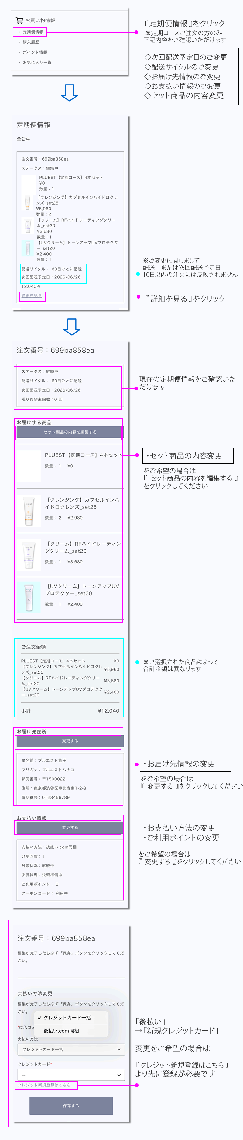 1. 定期便情報 ▶ 2. 購入履歴 ▶ 3. ポイント情報 ▶ 4. お気に入り一覧 ▶ 5. 会員情報 ▶ 6. お届け先一覧 ▶ 7. クレジットカード情報 ▶