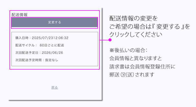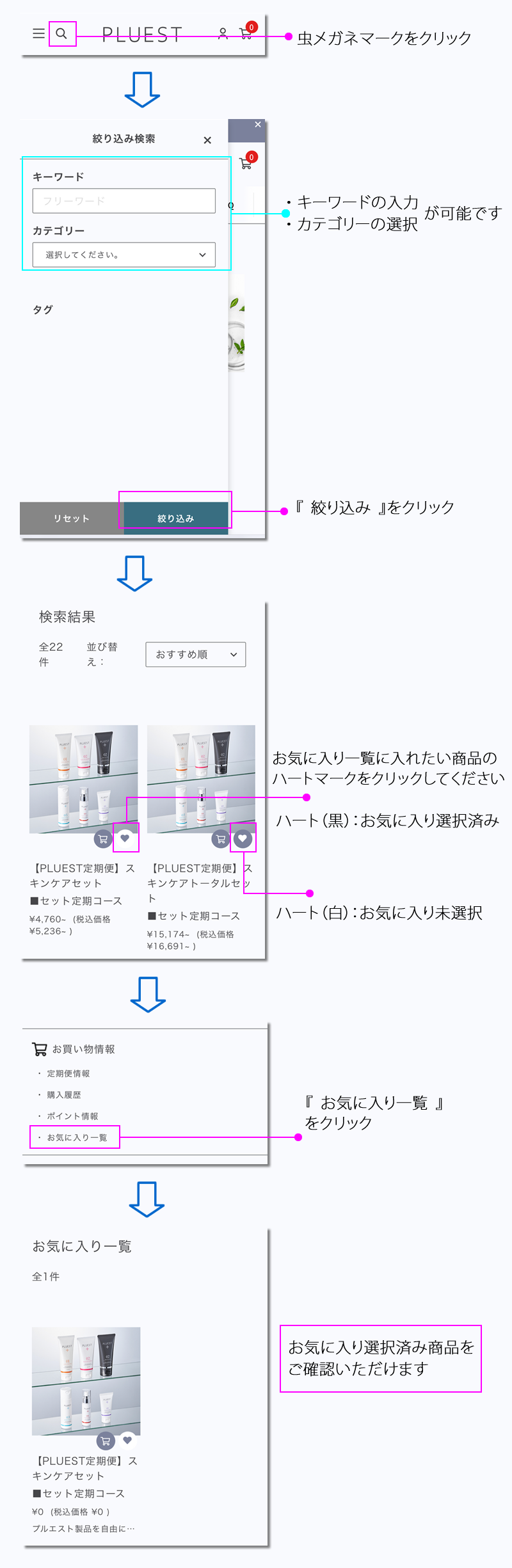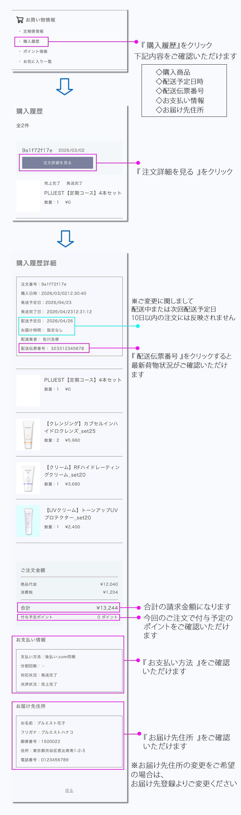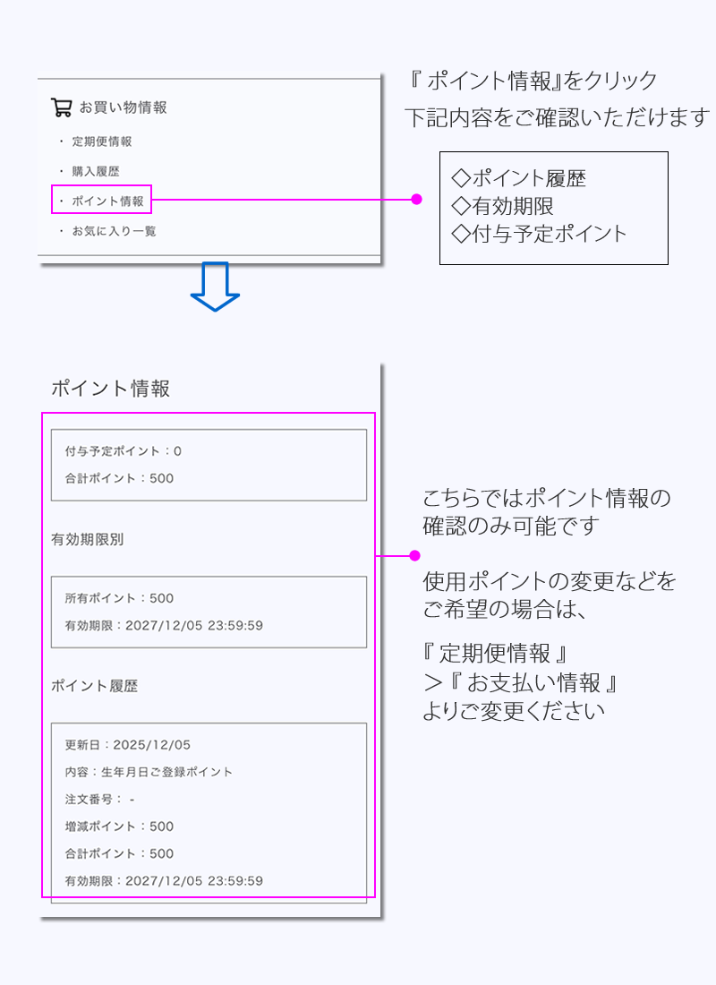 1. 定期便情報 ▶ 2. 購入履歴 ▶ 3. ポイント情報 ▶ 4. お気に入り一覧 ▶ 5. 会員情報 ▶ 6. お届け先一覧 ▶ 7. クレジットカード情報 ▶